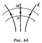 2. На рисунке 44 показаны линии напряженности электростатического поля и две эквипотенциальные поверхности. В какой точке (М или N) потенциал больше?