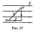 1. В однородном электростатическом поле положительный заряд из точки М в точку N перемещается по разным траекториям (рис. 47). В каком случае работа сил электростатического поля больше?