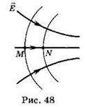 2. На рисунке 48 показаны линии напряженности электростатического поля и две эквипотенциальные поверхности. В какой точке (М или N) меньше потенциал?