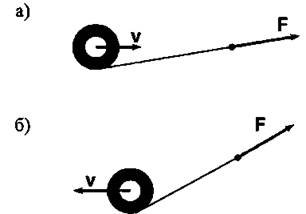 4. Повторите опыт несколько раз, увеличивая угол направления прикладываемой силы. Наступит момент, когда катушка перестанет катиться к вам, остановится и далее покатится в обратную сторону, разматывая нить (см. рис. б).