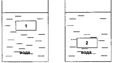 4. Два одинаковых параллелепипеда, 1 и 2, находятся в двух сосудах с жидкостью. Сравните выталкивающие силы, действующие на каждый параллелепипед.