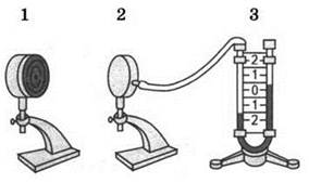 161. Учитель провёл следующий опыт. Раскалённая плитка (1) размещалась напротив полой цилиндрической закрытой коробки (2), соединённой резиновой трубкой с коленом U-образного манометра (3). Первоначально жидкость в коленах находилась на одном уровне. Через некоторое время уровни жидкости в манометре изменились (см. рисунок).