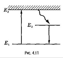 2. Спонтанное излучение. В отсутствие внешних полей или столкновений с другими частицами электрон, находящийся в возбужденном состоянии, через время порядка 10-8-10-7 с спонтанно (самопроизвольно) возвращается в основное состояние, излучая фотон (рис. 4.10, б).