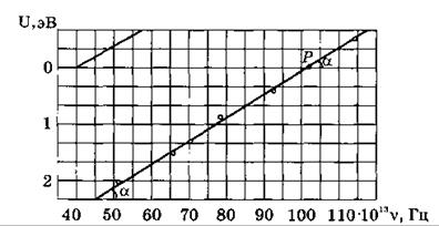 С1. Пользуясь приведенным на рисунке экспериментальным графиком зависимости задерживающего напряжения Us от частоты падающего света v (опыты Милликена, 1916 г., подтвердившие теоретическое уравнение Эйнштейна для фотоэффекта), рассчитайте постоянную Планка h, работу выхода А и красную границу фотоэффекта v0 и λ0 для исследуемого металла.