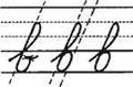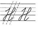 1. Кладём качалочку, уходим далеко вправо вверх (до 1/3 в дополнительной строке), на 1/3 среднюю выписываем секрет. По секрету наклонная линия вниз, выписываем петельку на середине рабочей строки. (Перехлёст в петельке на середине строки, далее выходим или на середину, или 1/3 снизу, 1/3 сверху, или на верхнюю линию. Зависит от последующей буквы, например н, л, с, в. Длина петельки равна 1/2 высоты рабочей строки, ширина — 1/3 высоты строки. Сама петелька выписывается в средней третьей части рабочей строки.)