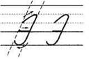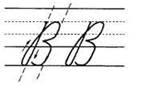 1. Ставим ручку на 1/3 сверху в дополнительной строке, опускаемся по наклонной линии, кладём петельку (не доходя 1/3 рабочей строки, уходим влево и выписываем петельку на нижней линеечке рабочей строки, длина которой равна 1/2 рабочей строки, а высота — 1/3 рабочей строки) на строку, выполняем перехлёст на 1/3 снизу на наклонной, резко опускаемся и задерживаемся на строке, поднимаемся вверх, плавно закругляя, опускаемся вниз. (Перехлёст с верхней линеечкой и прямой наклонной линией на 1/3 от высоты рабочей строки.)