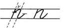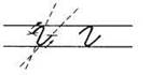 1. Ставим ручку на 1/3 сверху в дополнительной строке (или ставим ручку на условную линию), опускаемся по наклонной линии, выполняем клюшку. Вновь ставим ручку на 1/3 сверху, по наклонной опускаемся вниз, выполняем качалочку, поднимаемся по крючку до середины. В средней части дополнительной строки выписываем перевёрнутую клюшку. (При этом все внимание переносим на горизонтальную линию выше клюшки и тем самым сохраняем параллельность линий. Длина горизонтальной линии по правую сторону наклонной должна быть равна ширине клюшки слева.)
