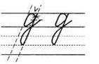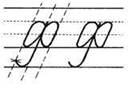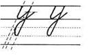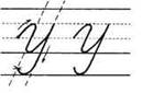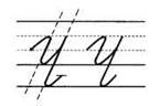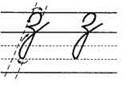 1. Ставим ручку на верхнюю линеечку рабочей строки, опускаемся по наклонной линии вниз, качалочка, крючок до середины, секрет, по секрету наклонная линия вниз, качалочка, крючок до 1/3, без поворота ручки наклонная линия вниз (до 1/3 в дополнительной строке), петелька, перехлёст на нижней линеечке рабочей строки, крючок до середины.