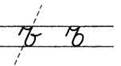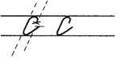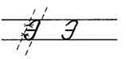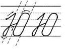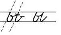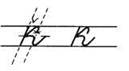 1. Ставим ручку на 1/3 сверху в дополнительной строке (или ставим ручку на условную линию), опускаемся по наклонной линии, выполняем клюшку. В средней части дополнительной строки выписываем перевёрнутую клюшку. (При этом все внимание переносим на горизонтальную линию выше клюшки и тем самым сохраняем параллельность линий. Длина горизонтальной линии по правую сторону наклонной должна быть равна ширине клюшки слева.)