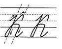 1. В средней третьей части дополнительной строки выписываем острый крючок (без поворота ручки на месте), опускаемся вниз по наклонной линии, влево выписываем петельку (перехлёст на середине высоты буквы, т. е. чуть выше верхней линеечки рабочей строки), прижимаясь к наклонной линии, уходим вверх до условной линеечки, разворачиваем ручку, опускаемся по наклонной на 1/3 среднюю и снимаем ручку. Ставим на середину наклонной и выписываем стульчик (на ширину буквы уходим по прямой вправо, разворачиваем ручку и по наклонной опускаемся вниз), качалочка, крючок до середины.