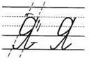 2. С 1/3 влево вверх, крышечка, опускаемся, задержались, большим секретом уходим в дополнительную строку, развернули ручку и влево на ширину буквы.