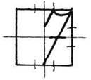 Ставим ручку на 1/3 сверху от высоты клеточки и чуть правее её центра. Поднимаемся до верхней линии, задерживаемся на 1/3 вправо, плавно срезаем верхний уголок; опускаемся по правой стороне клеточки на 1/3; резко уходим в левый нижний квадратик (до 1/3 от левого нижнего уголка), немного выгибая наклонную влево. Затем острым уголком поднимаемся чуть-чуть по этой же наклонной и выписываем двойную дужку (плавный переход в верхней и нижней частях). Глубина дужки чуть меньше 1/3 высоты клеточки, точнее — 1/5 её высоты. Ширина каждой части дужки соответствует 1/3 ширины клеточки.