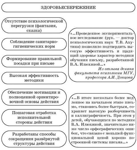 В разработанной системе можно выделить два направления организации учебной деятельности, взаимодополняющие и обогащающие друг друга. С одной стороны, это включение всех сфер психики ребёнка в процесс овладения графическим навыком, обеспечение осознания учеником значимости предстоящей ему деятельности, вселение в него уверенности в успешность её осуществления, исключение отрицательных эмоций, связанных с письмом. С другой стороны, предъявление детям достаточно жёстких требований к выполнению графических действий, которые необходимы для овладения правильным графическим навыком.
