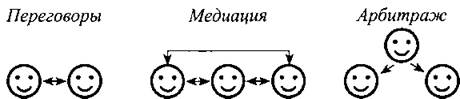Процессы, служащие для разрешения конфликтов: переговоры, медиация, арбитраж. Большинство межличностных конфликтов решаются с помощью одного из трех процессов.